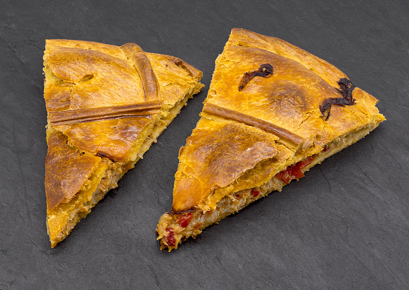 Nuestras empanadas las elaboramos con Xouba fresca procedente de la lonja de A Coruña, a la que le quitamos espina y cabeza, extendiendo manualmente el filete entero resultante, en la parte superior de la empanada, antes de cerrarla.